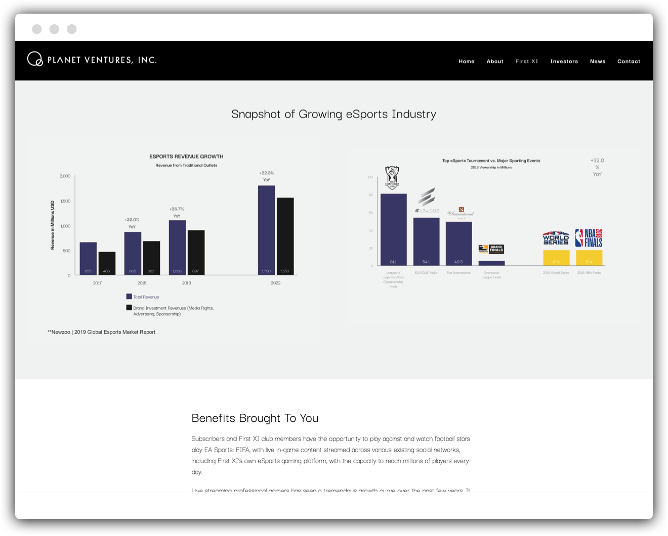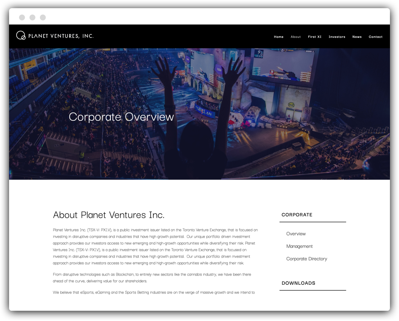 Planet Ventures Inc. (PXI.V), is a public investment issuer that is focused on investing in disruptive companies and industries such as eSports and eGaming. Both are billion dollar industries with huge growth potential. We helped this modern company rebrand their online presence to better communicate these investment goals.